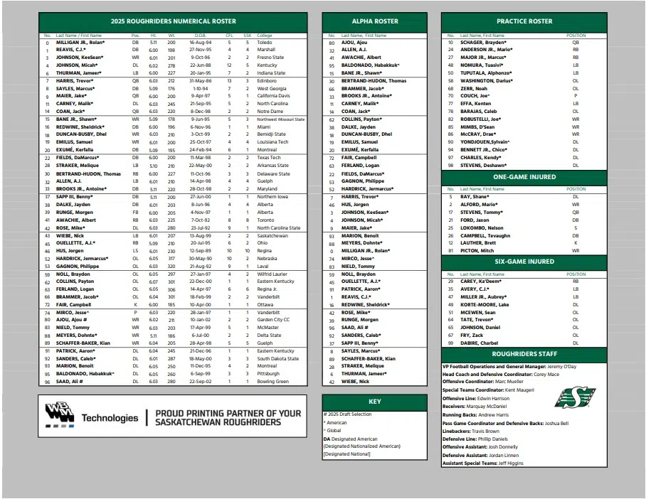 Campbell Fair will make his CFL debut as the kicker comes onto the Riders’ roster for Brett Lauther, who is out with a back injury. Lauther has struggled this season, only hitting on 68.9 per cent of his field goal attempts.