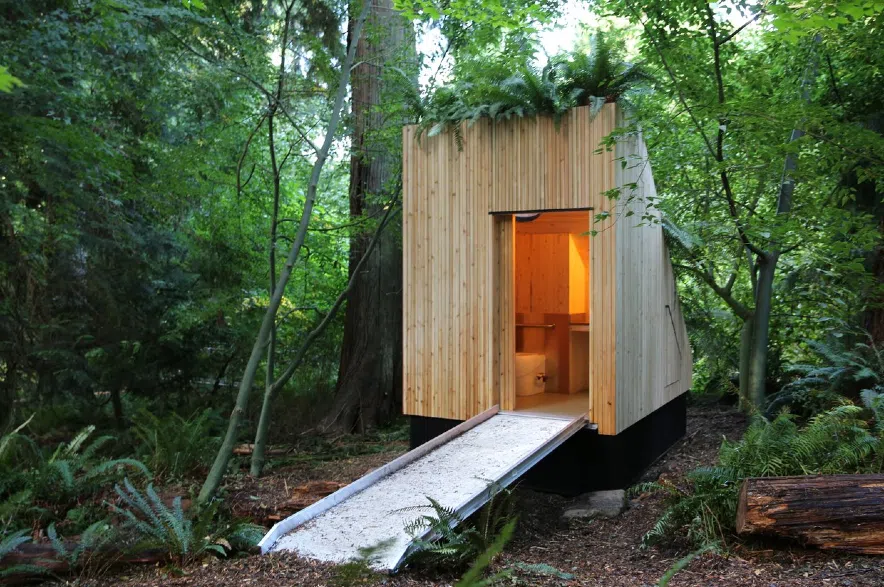 It’s described as the world’s first such toilet, turning human waste into compost using mycelia, the root network of mushrooms. The MycoToilet, inside the small cedar-sided building, has been dropped in among the trees at the university’s Botanical Garden for a six-week test run.
