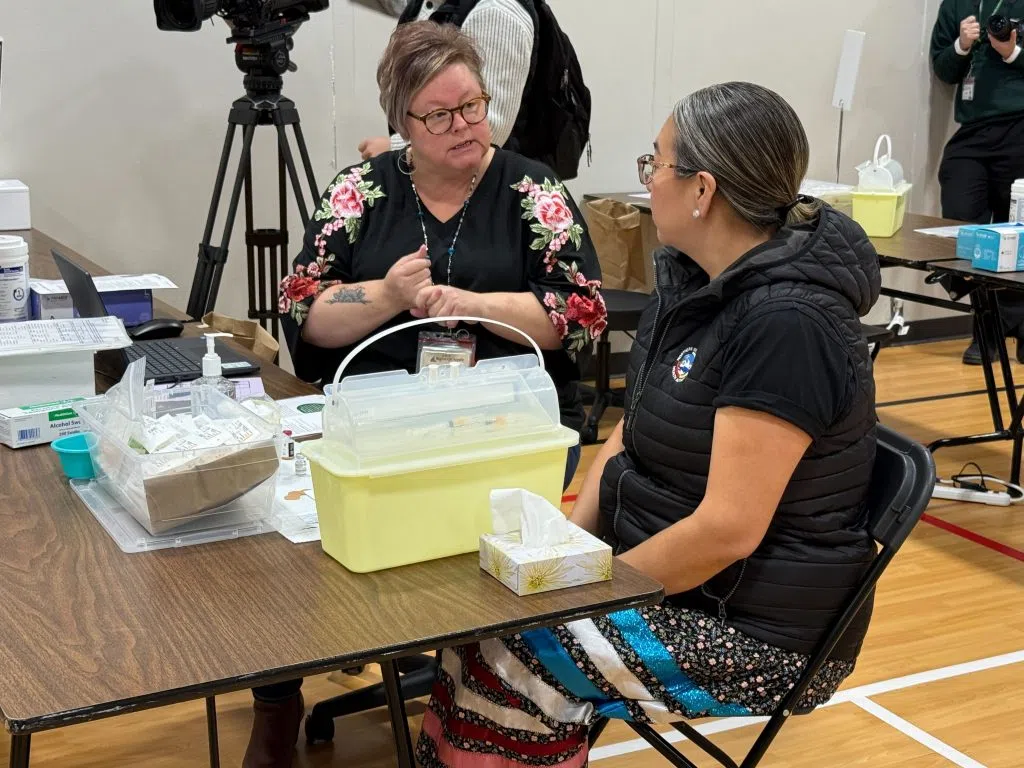 Pauline “Sunshine” Dreaver and a health-care provider do a quick consultation before Dreaver receives her vaccinations. (Nicole Garn/980 CJME)