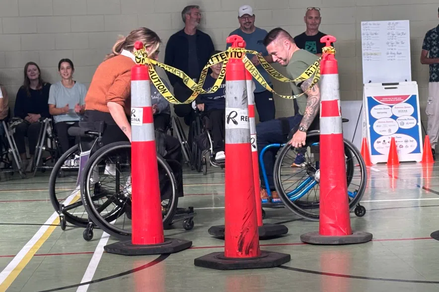 New staff member Braden Pettinger takes part in Spinal Cord Injury Saskatchewan’s Wheelchair Relay at the Wascana Rehabilitation Centre. (Jacob Bamhour/980 CJME)