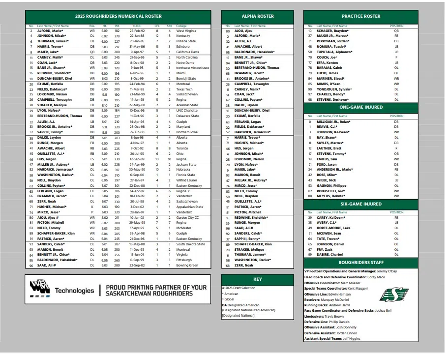 Some other moves for the Riders this week include safety Nelson Lokombo making his return to the lineup. Quarterback Trevor Harris and running back AJ Ouellette are back as well, but could be on a snap count.