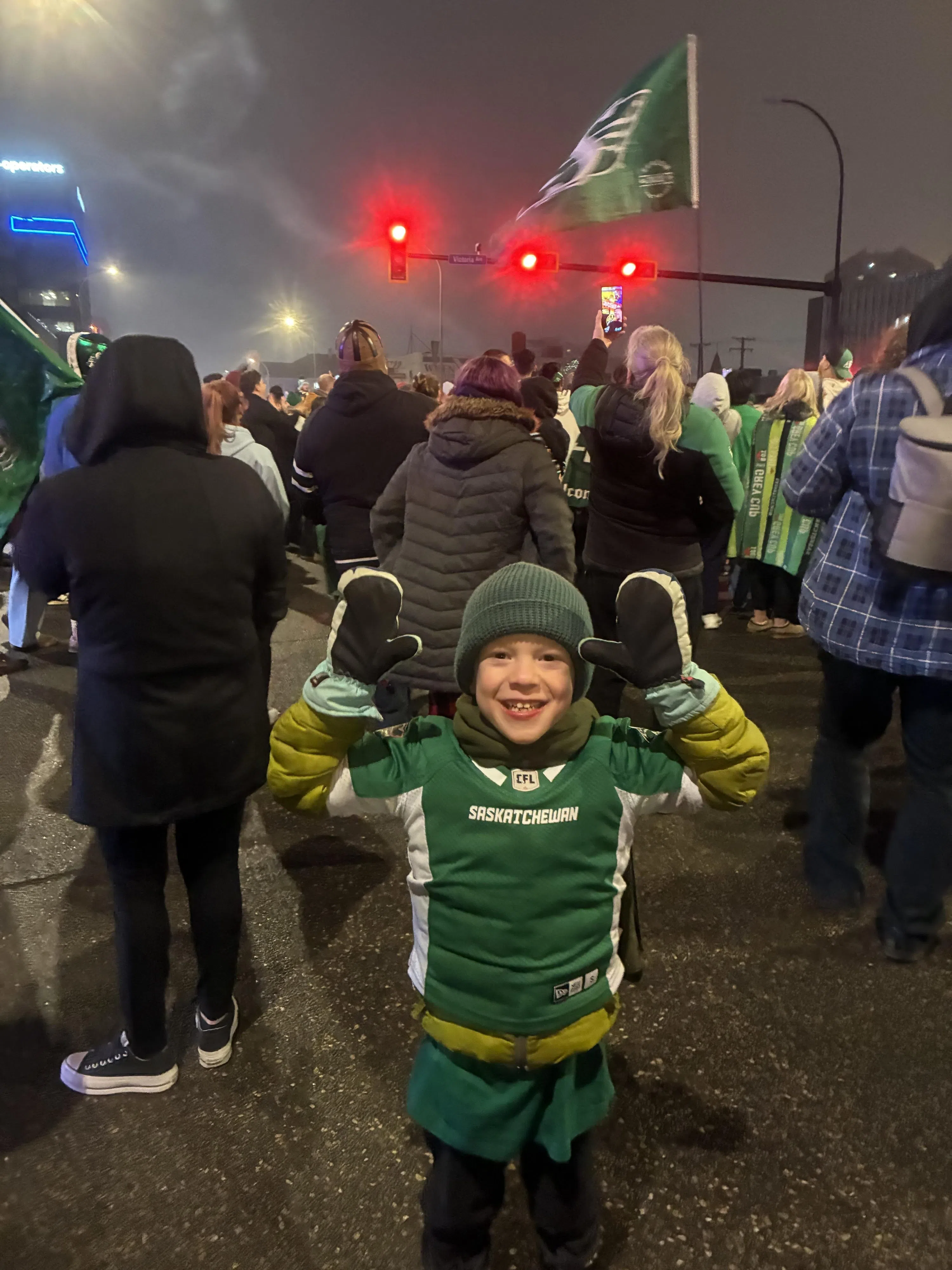 Six-year-old Linden Wood celebrates the Riders’ Grey Cup win on the “Green Mile” in Regina. (Submitted)