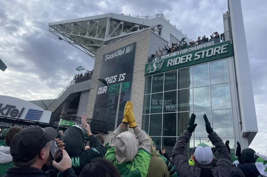 Fans dressed in green and white cheered as the Saskatchewan Roughriders held the Grey Cup high at Mosaic Stadium on Monday.