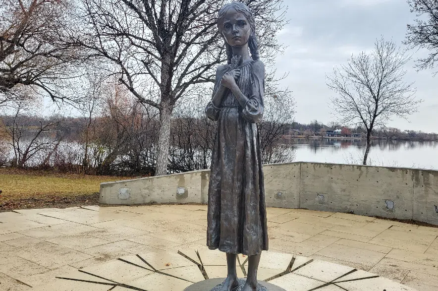 "Bitter Memories of Childhood," a replica statue commemorating the Holodomor, located on southeast of the Legislative Building on Lakeshore Drive. (Daniel Reech/980 CJME)