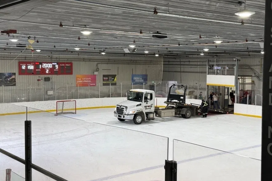 A tow truck on the ice at the Tom Zandee Sports Arena after a Zamboni at the arena caught on fire Sunday. (Chelsea Manz/Submitted to Discover Weyburn)