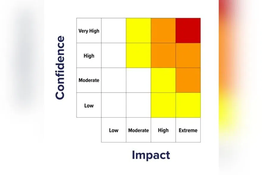 Orange alerts are issued when the potential impact is high and confidence is high or very high, or when the possible impact is extreme and confidence is moderate or high.