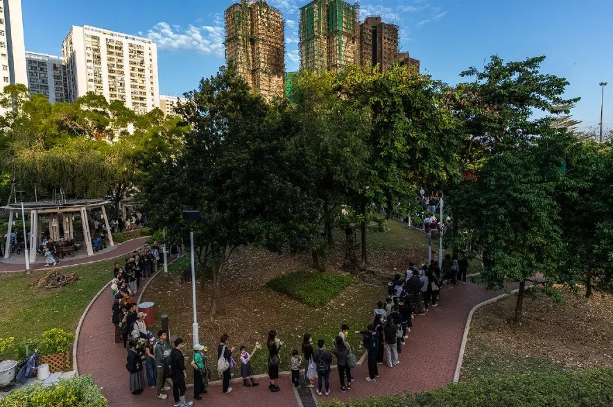 People hold flowers and line up near the site to mourn the victims of the deadly Wednesday fire at Wang Fuk Court, a residential estate in the Tai Po district of Hong Kong's New Territories on Saturday, Nov. 29, 2025. (THE CANADIAN PRESS/AP-Chan Long Hei)