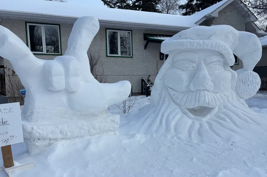 The sculpture series was part of Nurkowski’s annual holiday build and his third year of fundraising for Big Brothers Big Sisters of Regina, according to the organization. The display includes a giant smiling Santa head and the American Sign Language symbol for “I love you.”