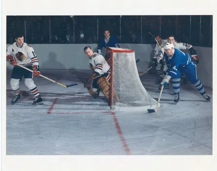Glenn Hall in net for the Chicago Blackhawks during a game against the Toronto Maple Leafs. (Saskatchewan Sports Hall of Fame)