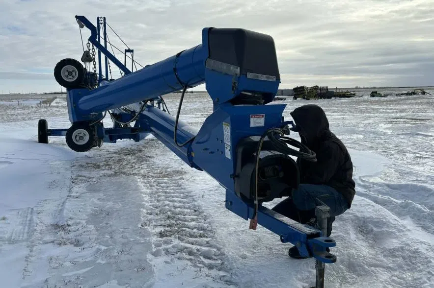 Leguee fixes something on an auger. (Gillian Massie/ 980 CJME)