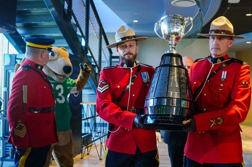 Why were two Mounties on stage with the Grey Cup in Regina on Monday?