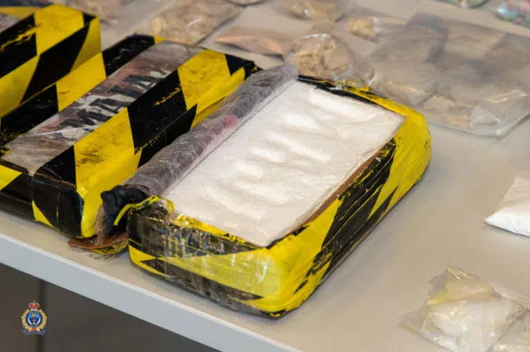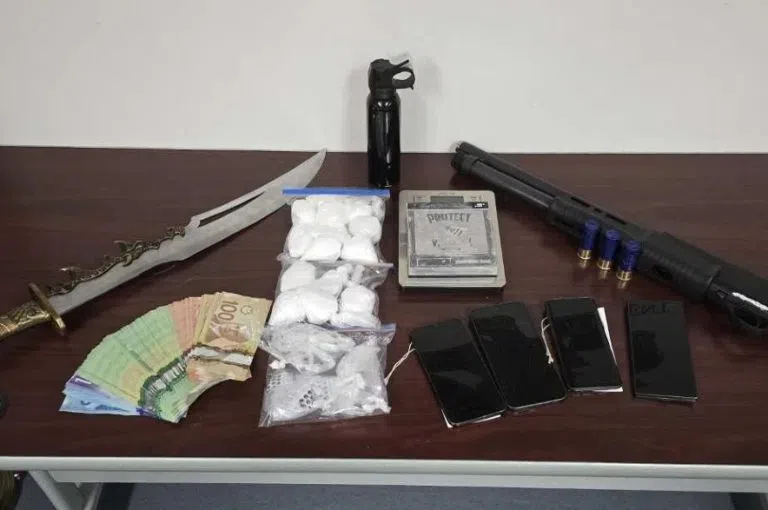 While investigating a stolen vehicle, RCMP officers said they saw a man with a firearm inside a business and during a search they found cocaine, crystal meth, a firearm, a sword, bear spray, and cash.